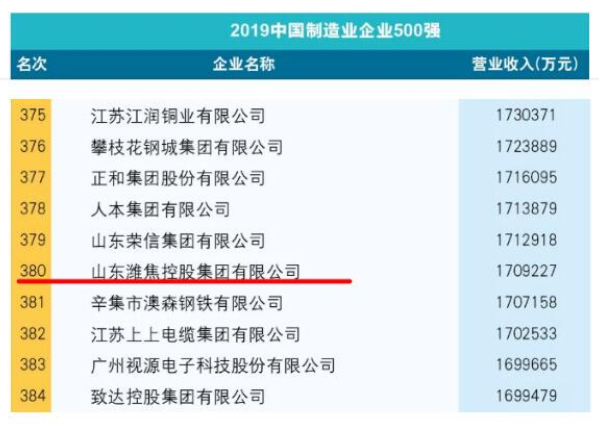 近日,在2019中國500強(qiáng)企業(yè)高峰論壇上,中國企業(yè)聯(lián)合會(huì)、中國企業(yè)家協(xié)會(huì)聯(lián)合發(fā)布了“2019中國制造業(yè)企業(yè)500強(qiáng)”榜單,山東濰焦控股集團(tuán)有限公司再次榮登榜單,位列中國制造業(yè)企業(yè)500強(qiáng)第380位,比去年提高了一個(gè)位次。