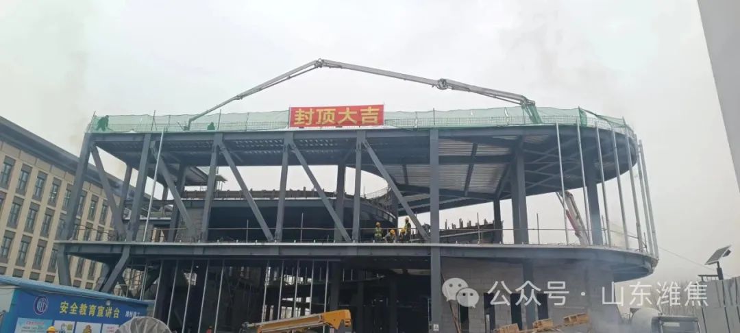 11月16日,伴隨著一車混凝土澆筑的完成,濰焦文化中 心項(xiàng)目經(jīng)過72天爭分奪秒日夜奮戰(zhàn),主體架構(gòu)順利封頂。
