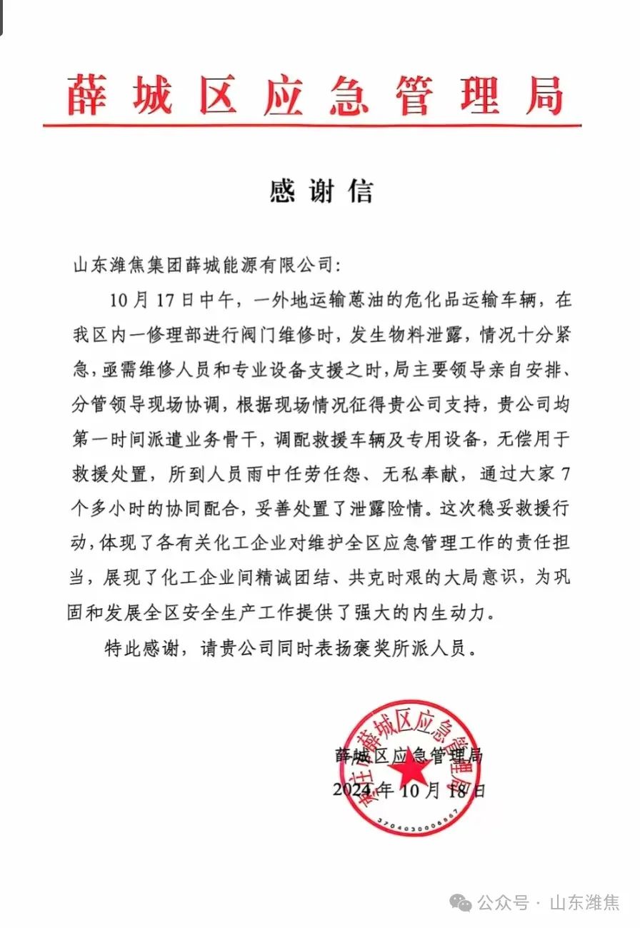 薛城能源公司收到薛城區(qū)應急管理局感謝信