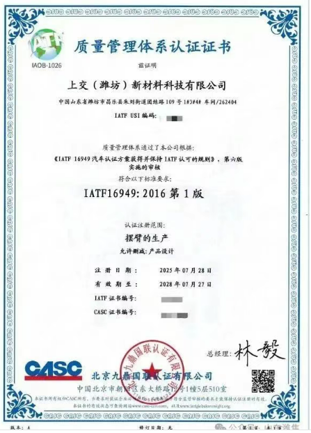 近日,上交(濰坊)新材料公司順利通過北京九鼎國聯(lián)認(rèn)證公司的嚴(yán)格審核,成功取得IATF16949質(zhì)量管理體系認(rèn)證證書,標(biāo)志著公司在汽車行業(yè)質(zhì)量管理領(lǐng)域邁入標(biāo)準(zhǔn)化、規(guī)范化階段。今年以來,公司統(tǒng)籌策劃、主動(dòng)作為,通過實(shí)施精細(xì)化管理,嚴(yán)格執(zhí)行體系標(biāo)準(zhǔn),規(guī)范生產(chǎn)作業(yè),保障產(chǎn)品質(zhì)量的穩(wěn)定可靠,并成功獲得體系認(rèn)證證書。下一步,公司將以IATF16949質(zhì)量管理體系為基石,持續(xù)深化體系運(yùn)行,強(qiáng)化全員質(zhì)量意識(shí)和過程管控,為企業(yè)的可持續(xù)健康發(fā)展注入強(qiáng)勁動(dòng)能。