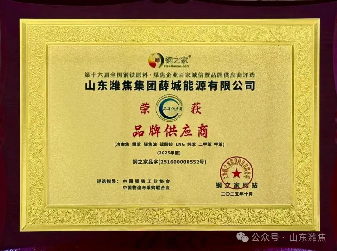 近日,“鋼之家第十六屆全國鋼鐵原料煤焦企業(yè)百家誠信暨品牌供應(yīng)商”評選活動順利舉行,經(jīng)鋼之家網(wǎng)站征信取證,中國鋼鐵工業(yè)協(xié)會及中國物流與采購聯(lián)合會專家綜合評審,山東濰焦集團(tuán)薛城能源有限公司被評為2025年度“品牌供應(yīng)商”殊榮。榮譽(yù)證書